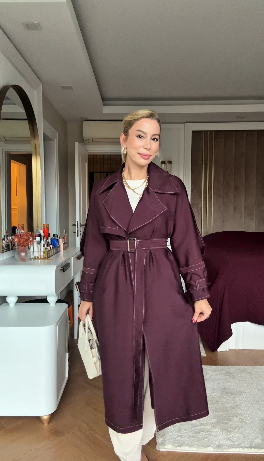 Trençkot Kolda ve Bilekte Kemer Detaylıdır.