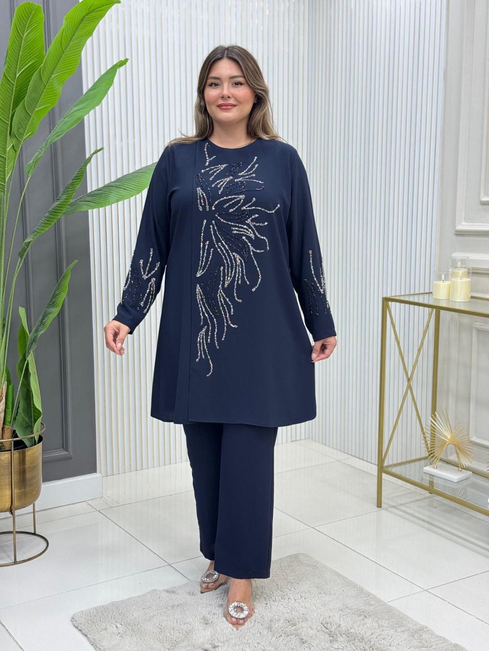 Tunik omuz kısmında pres taşlıdır.