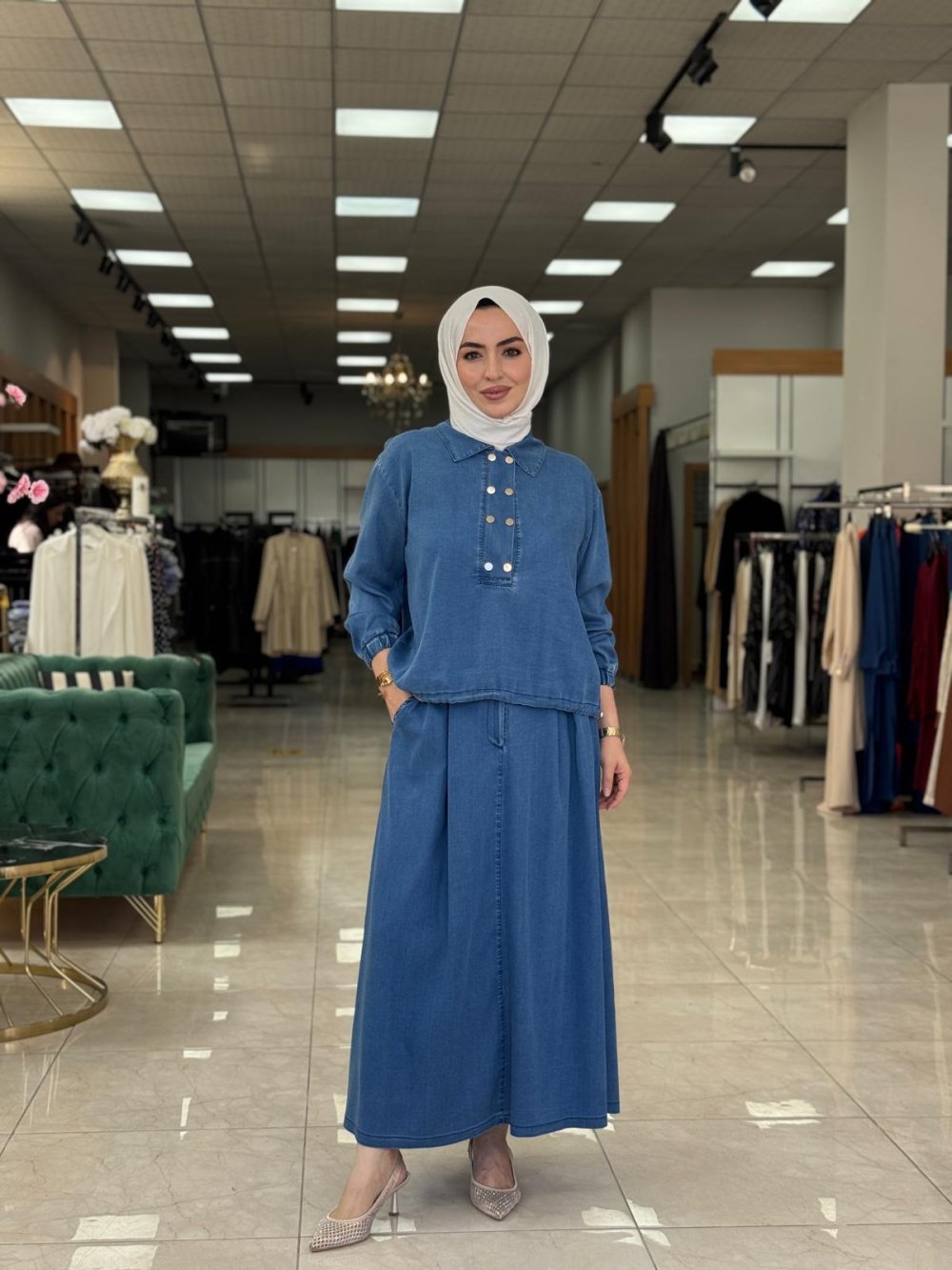 Tencel Yumşak Kot Kumaştır. Etek Cepli. Beli Lastiklidir. Ceket Yarım Pat Çıtçıtlı, Kol Ağızı Çıtçıtlı, Etek Tünel Lastiklidir.