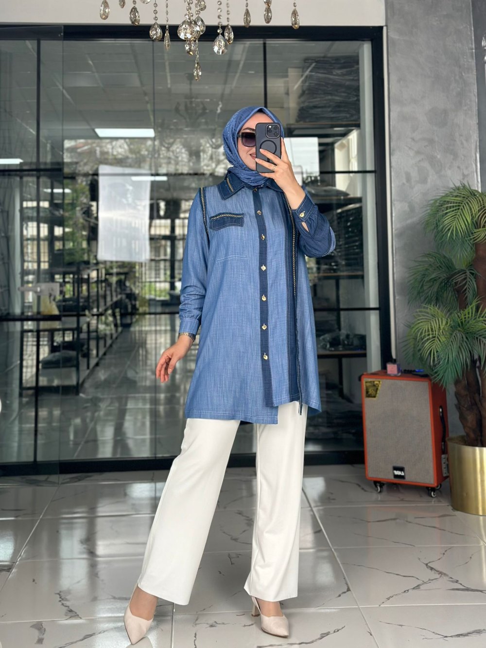 Tencel Kot Kumaş, Boydan Düğmeli,Zincir Aksesuarlı, Sahte Cep Kapaklı