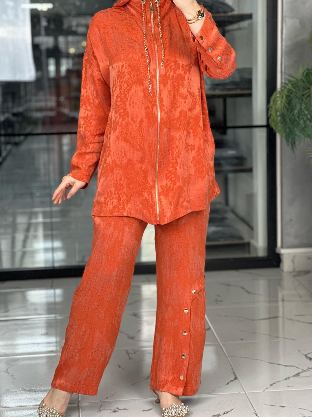 Qupra Kumaştır. Ceket Boydan Fermuarlı,Kapşonlu ve Yaka Zincir Aksesuarlıdır. Kol ve Pantolon Metal Çıtçıt Detaylı,Ceket Sahte Cep Detaylıdir.Pantolon Beli Lastiklidir.