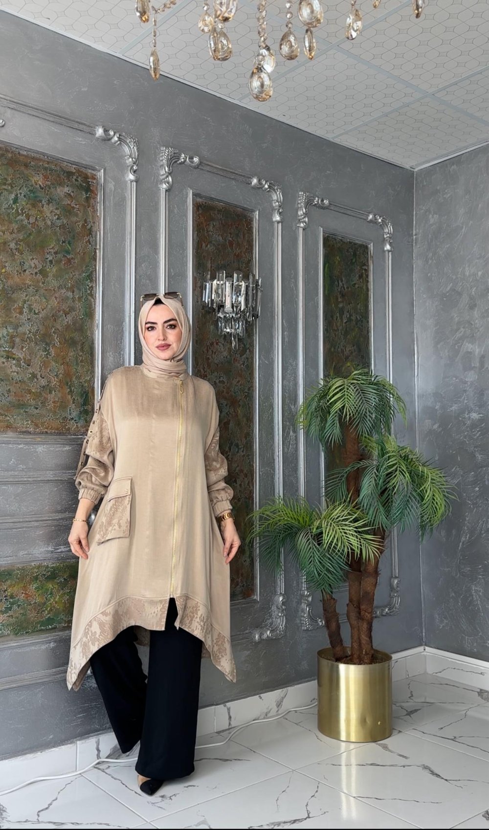 Taşlanmış İpek Qupra Kumaştır. Boydan Fermuarlı, Körüklü Cep Metal Düğme Çıtçıt Kapaklıdır. Kol Ağızı Lastikli,Kol Kuşgözü Aksesuar Şeritlidir.Eteği Asimetrik Kesimdir.