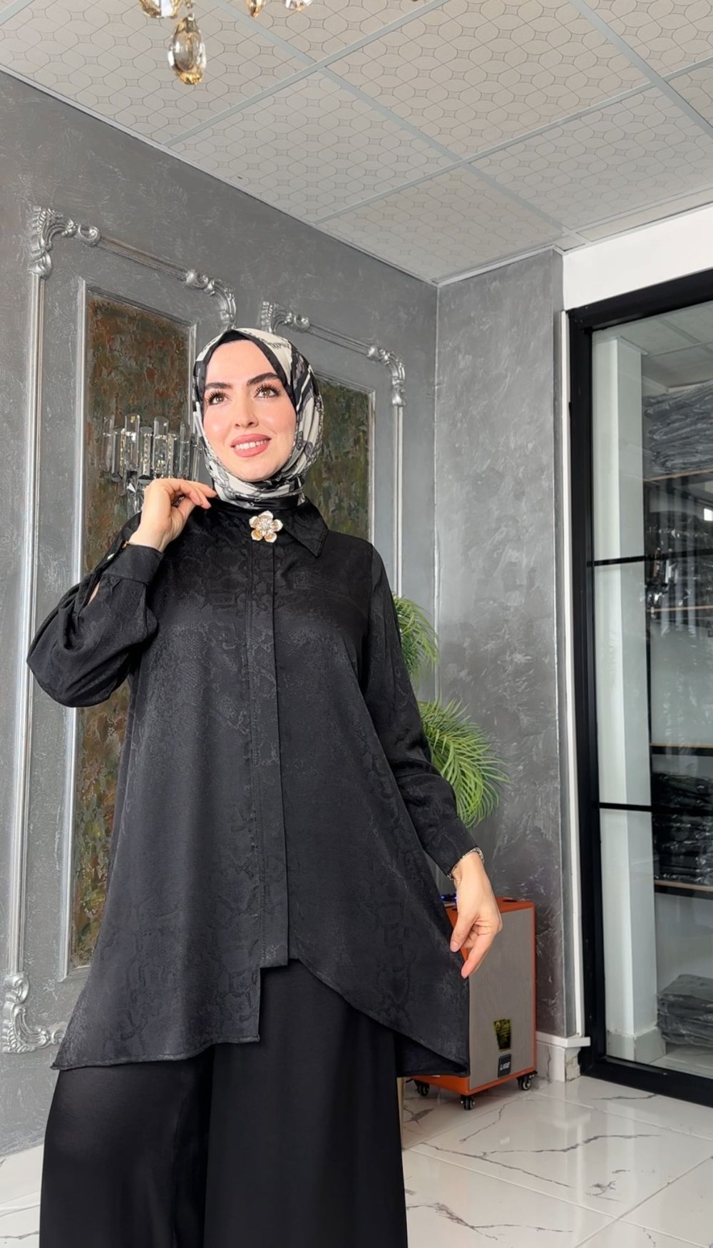 Jakar  Kumaş,Asimetrik Model,Gizli Pat,Aksesuar Detay,Arkası Pile ve Apolet Detaylı,Kol Manşetli, Bol Paça Rahat Kalıptır. Cepsizdir.