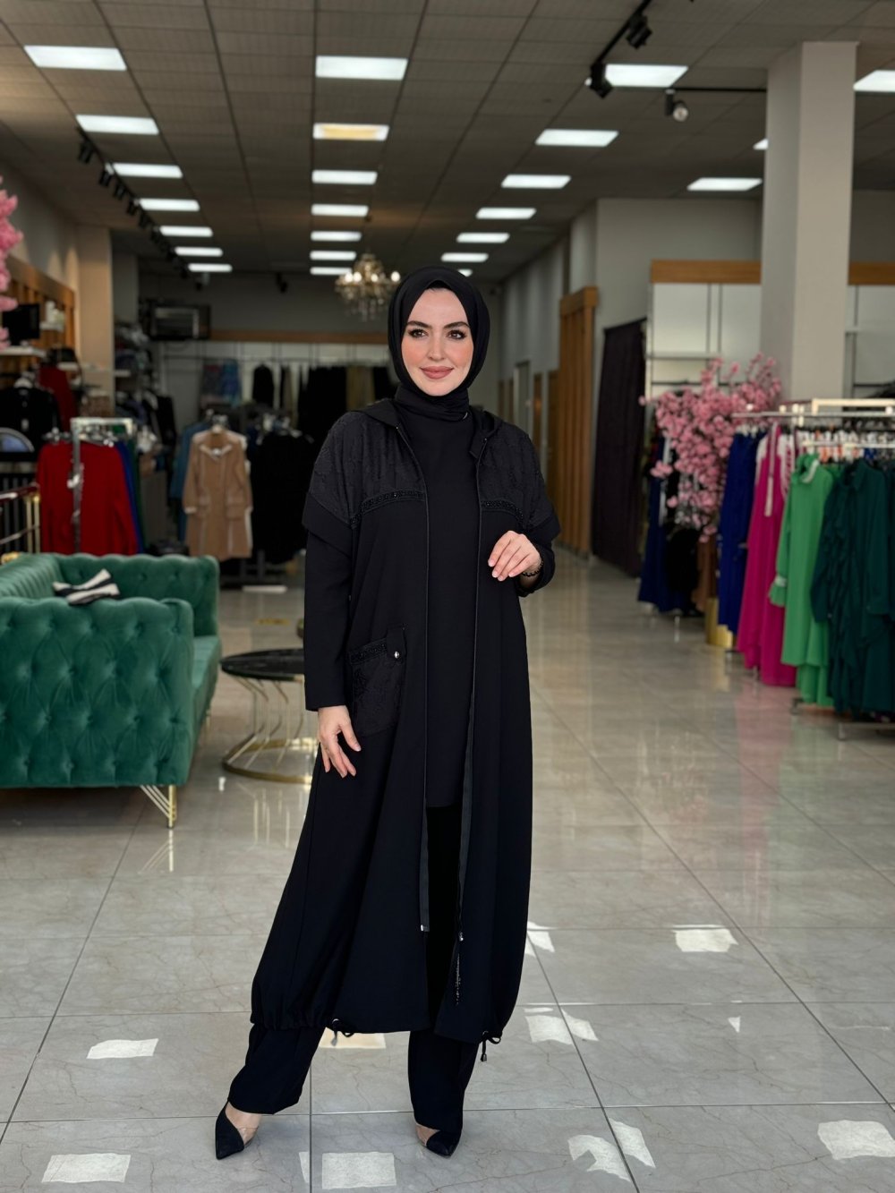 Kumaşı kreptir. Pantolon beli lastiklidir. Yeleğin ön kısmı fermuarlıdır.