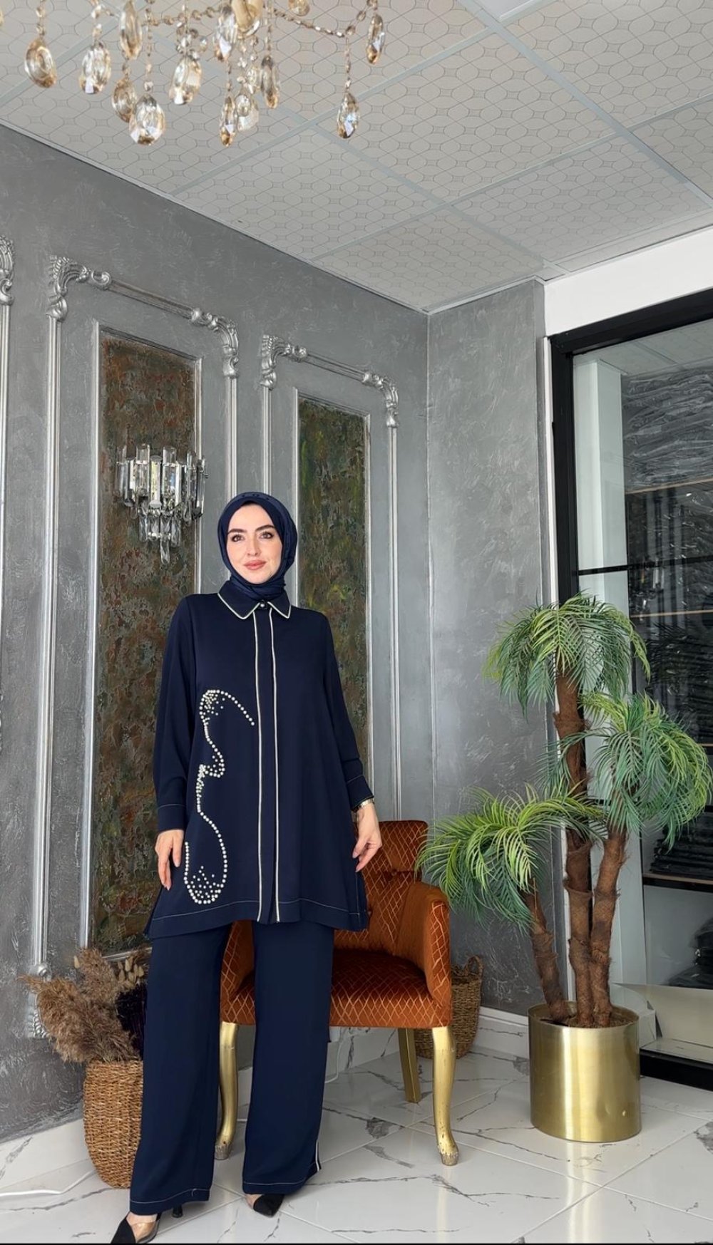 Kumaşı albino kreptir. Önü gizli kapaklı düğmelidir. Pantolon beli lastiklidir.