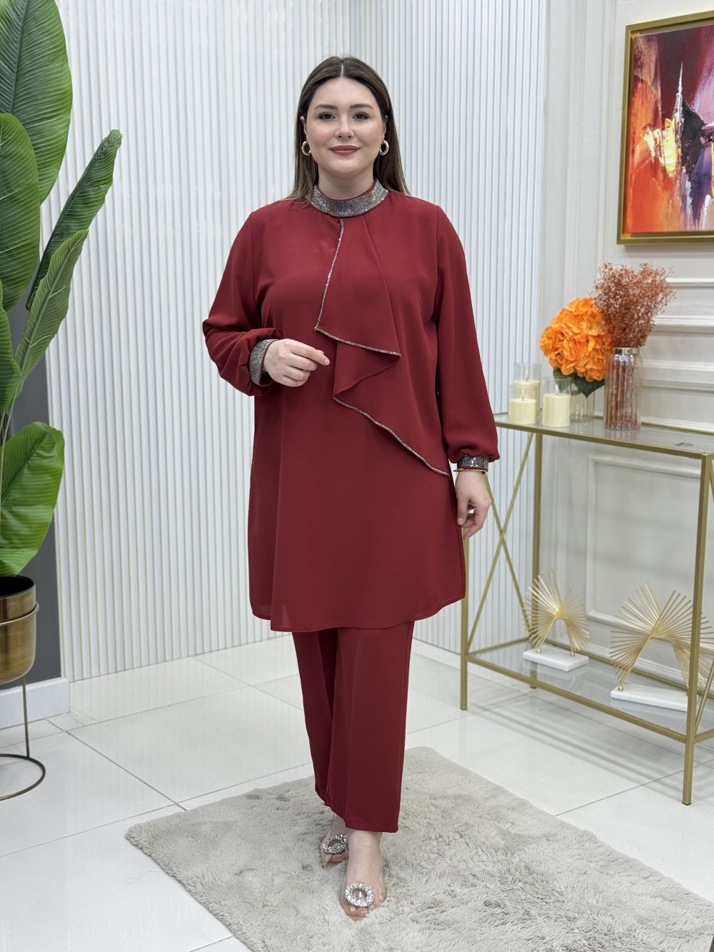 Kol uçları ve yaka tarafı taş işlemelidir.