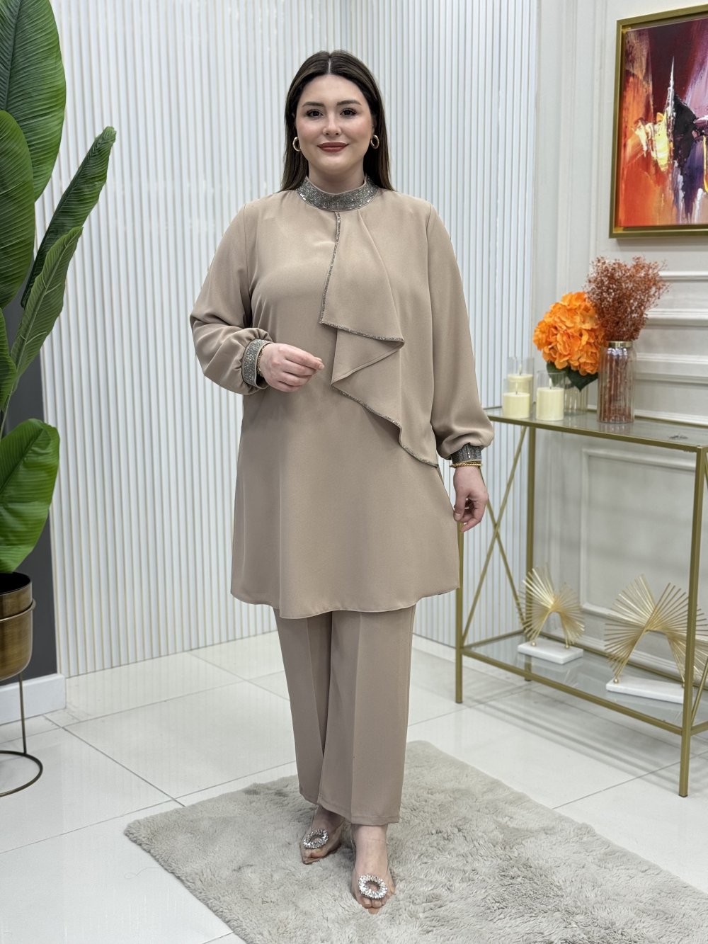 Kol uçları ve yaka tarafı taş işlemelidir.