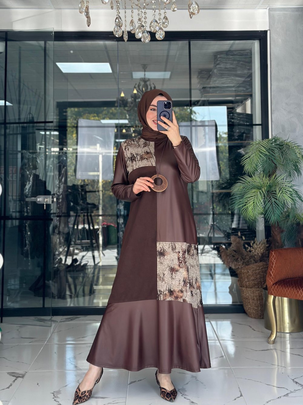Deri Kombin Elbise Kahverengi