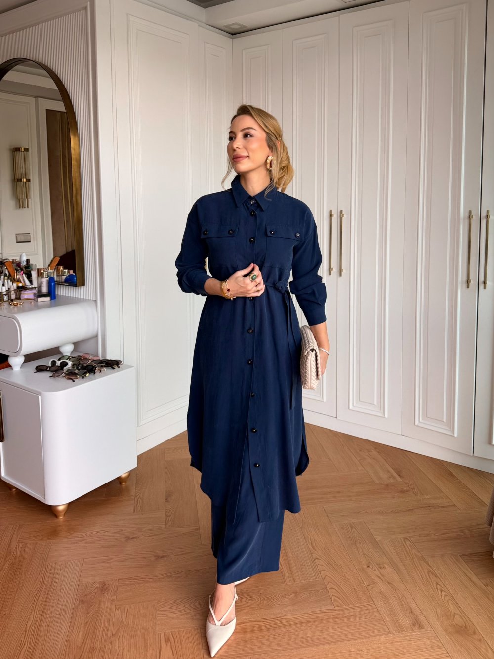 Takım Tunik Tam Boy Düğme Detaylıdır.