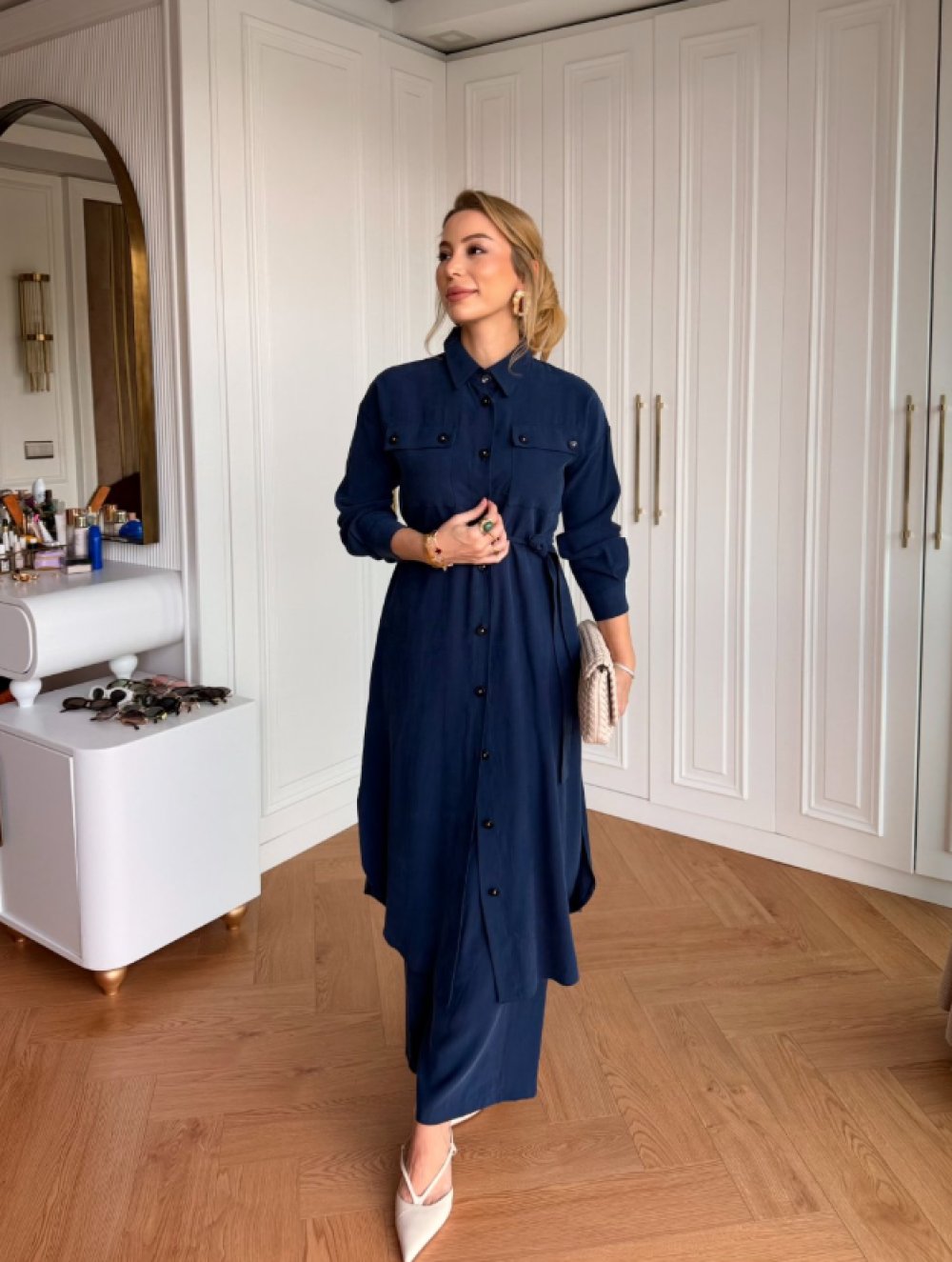 Takım Tunik Tam Boy Düğme Detaylıdır.