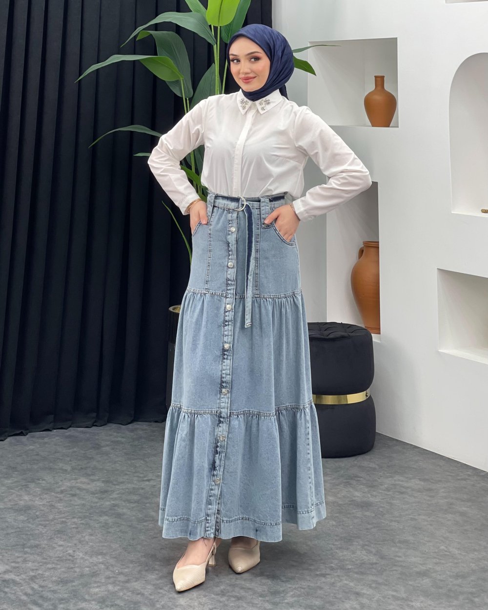 Düğmeli Kot Etek