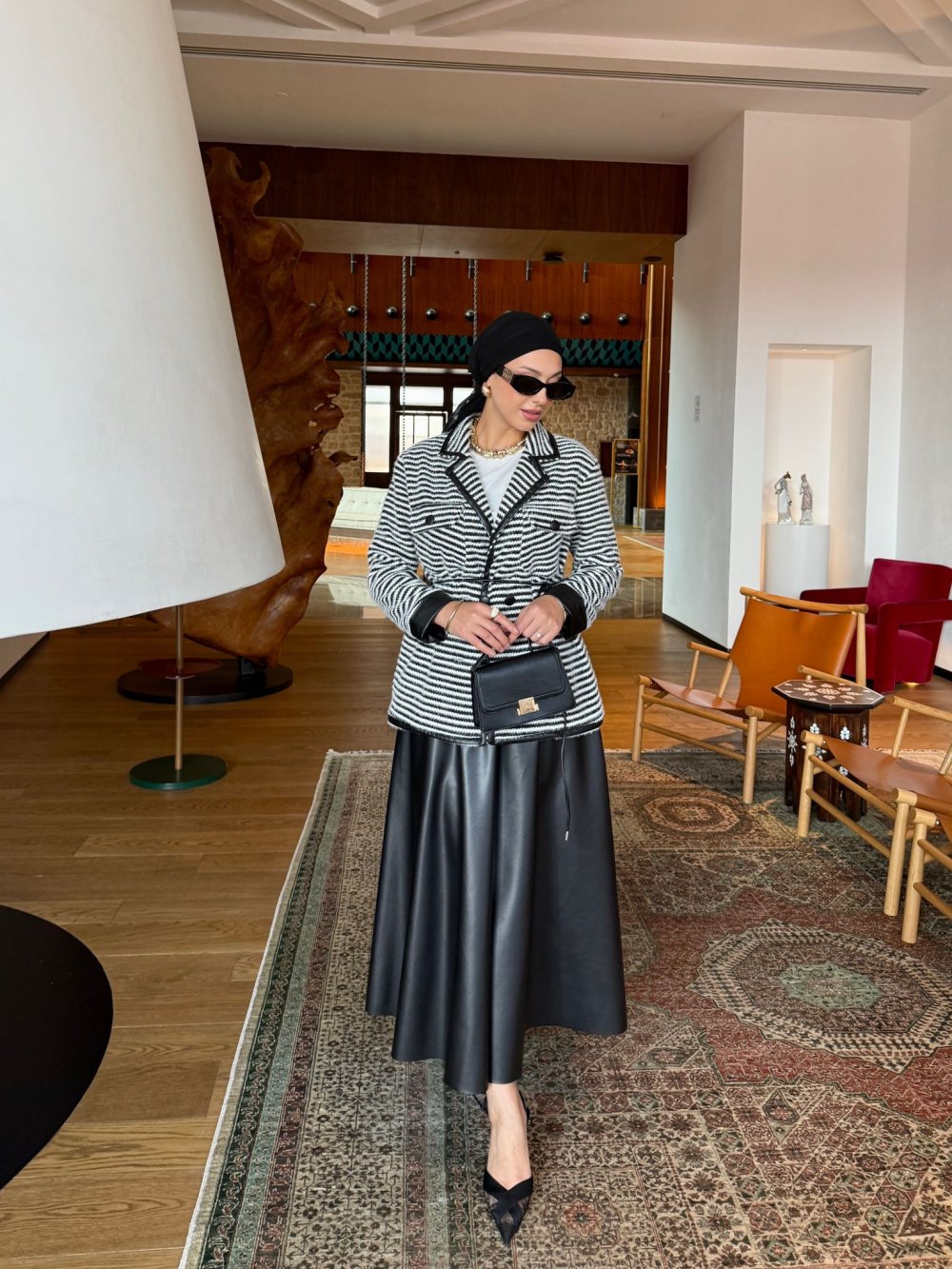 Takımın Ceketi Triko,Eteği Deri Kumaştır.