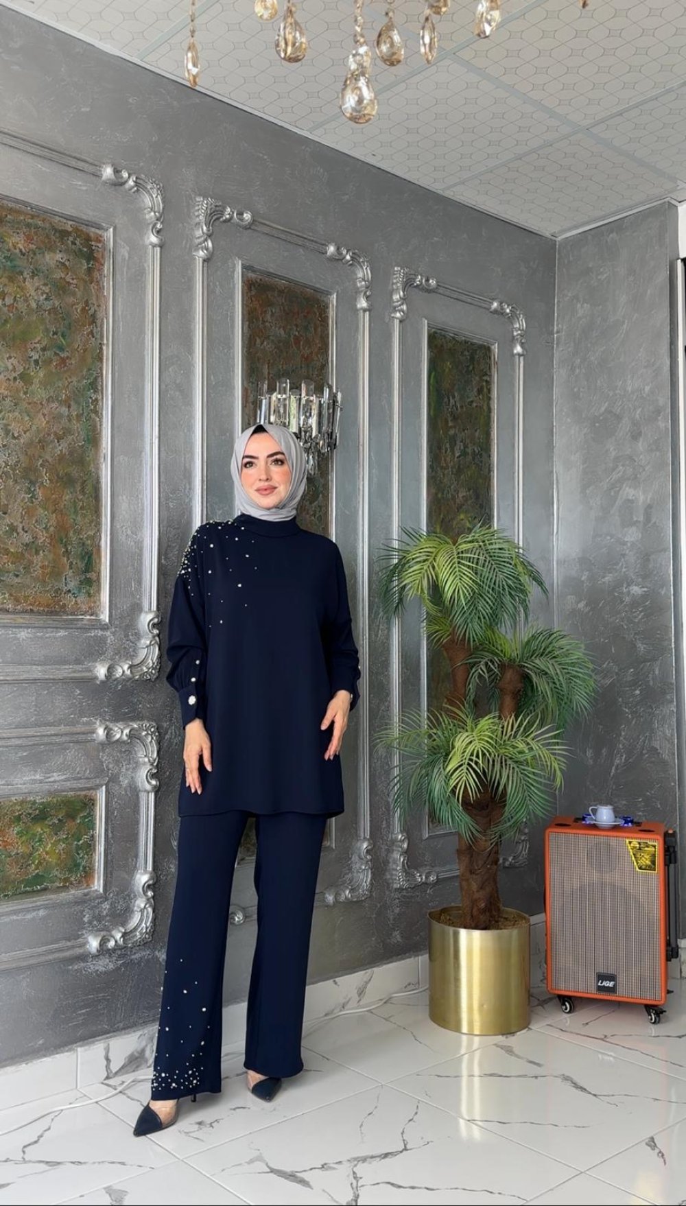 Pırlanta Krep Kumaş,Takım Çakma İnci Detaylı,Arkası Yarım Patlı, Kurtarıcı Dış Pile Detaylıdır. Pantolon Beli Lastikli,Tunik Kol Ağızı Manşetlidir.