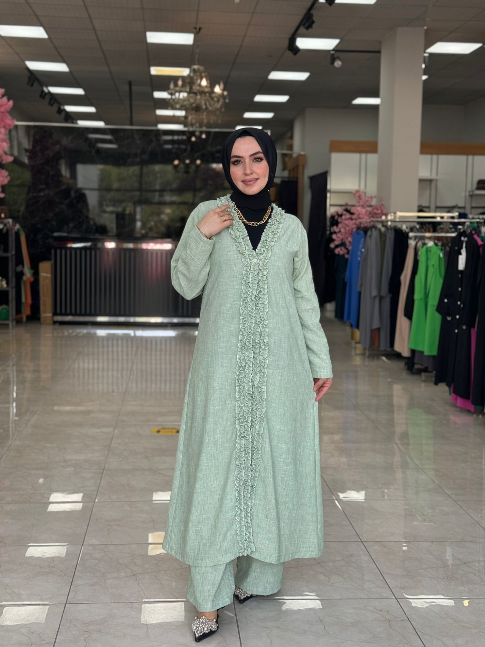 Kumaşı melanj ketendir. Pantolon beli lastiklidir. Önünde 1 adet