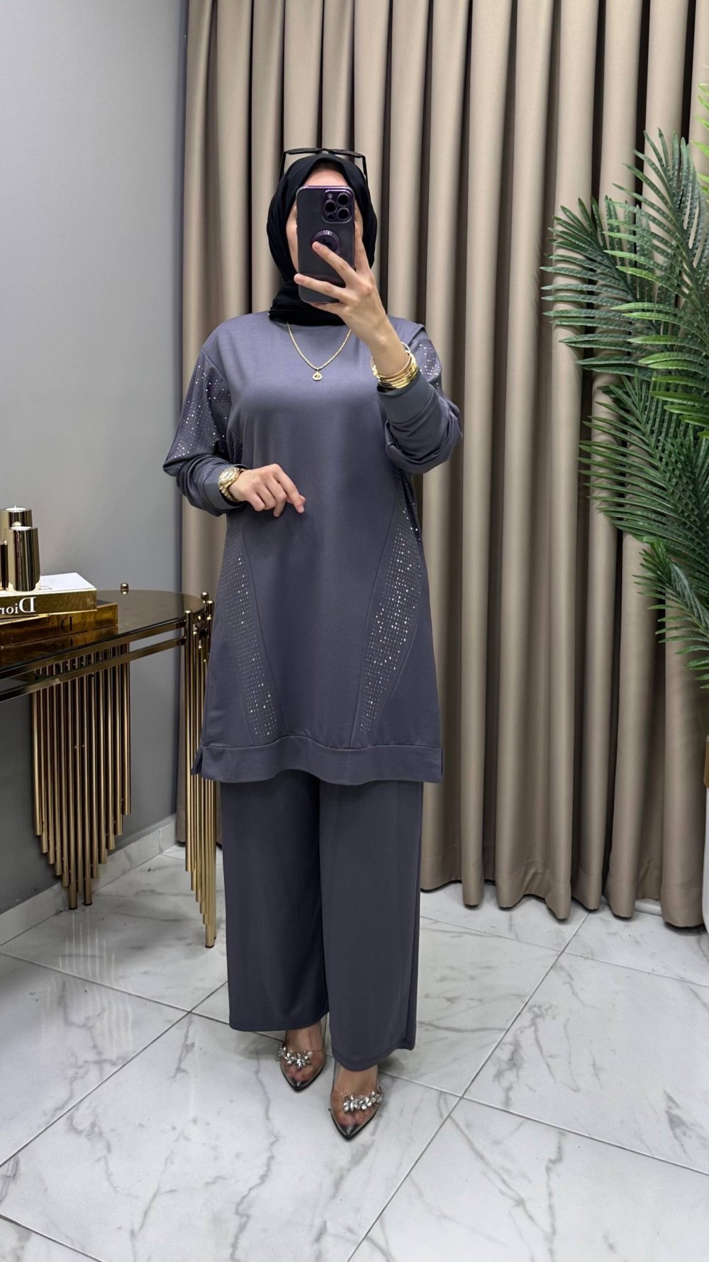 Hanımeli Taşlı Takım Füme Gri