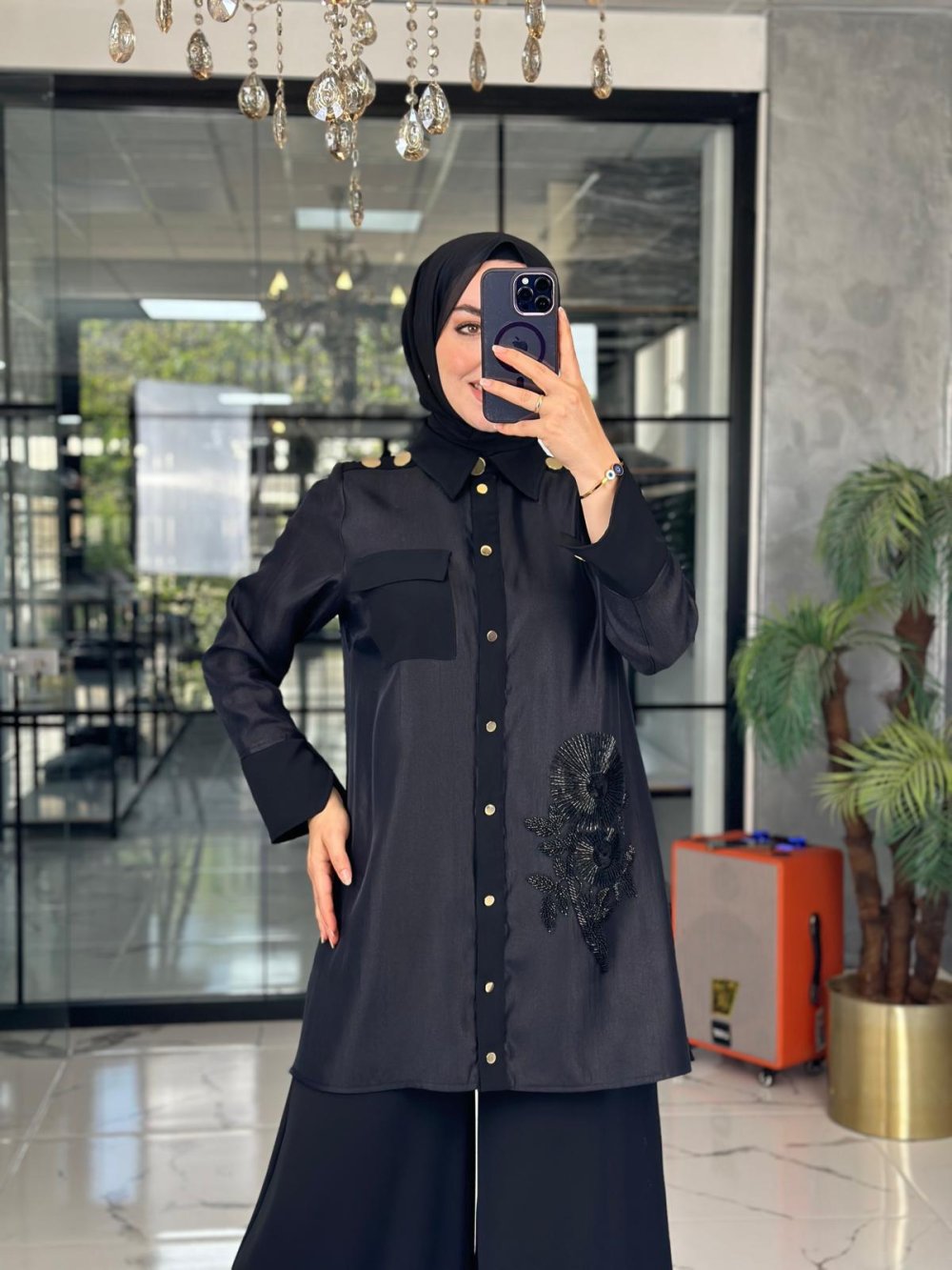 Gömlek Krep Jakar Kumaş,Pantolon Pırlanta Krep Kumaştır. Gömlek Ön Normal Patlı,Omuzlar Düğmeli,Gömlek Sağ Aplike Detaylı, Bolpaça,Rahat kalıptır.