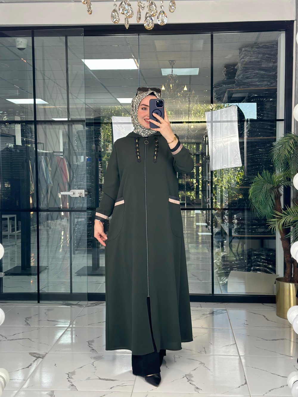 Kumaşı kreptir. Şapkası sabittir. Cepleri mevcuttur.