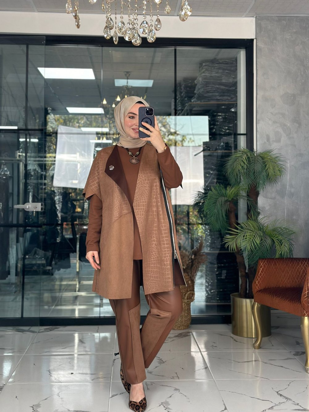 Kumaşı süet, deri ve çelik örmedir. Pantolon beli lastiklidir.