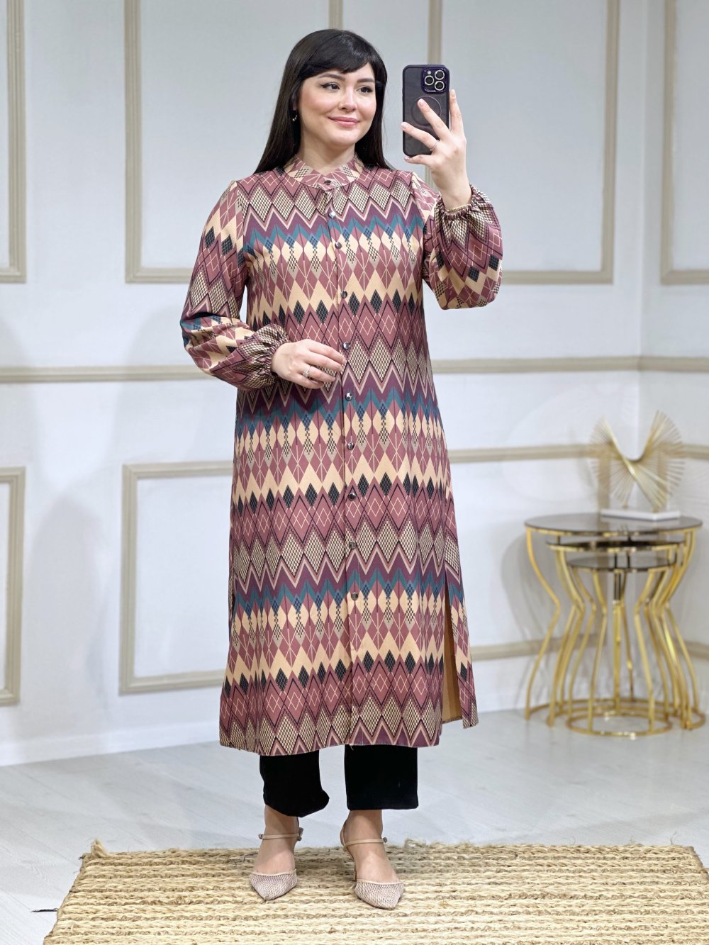 Tunik kolları lastiklidir, boydan düğmelidir.