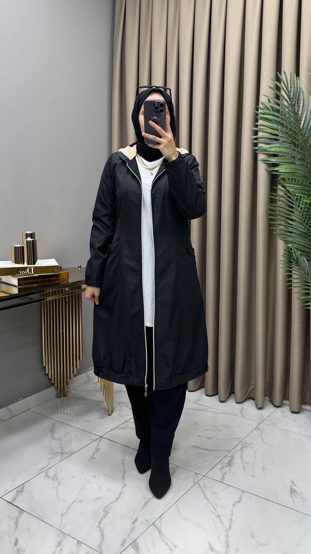 Bondit kumaş,kapşonu kürklüdür, kolları elyaf dolgulu,fermuarlı,