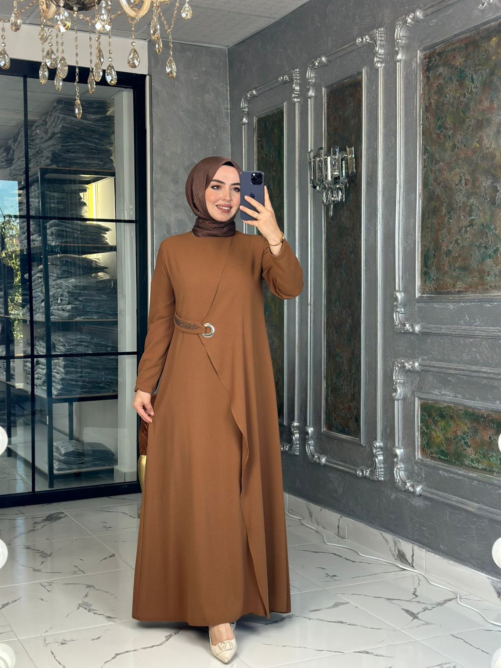 Kuş Gözü Detaylı Elbise-Taba