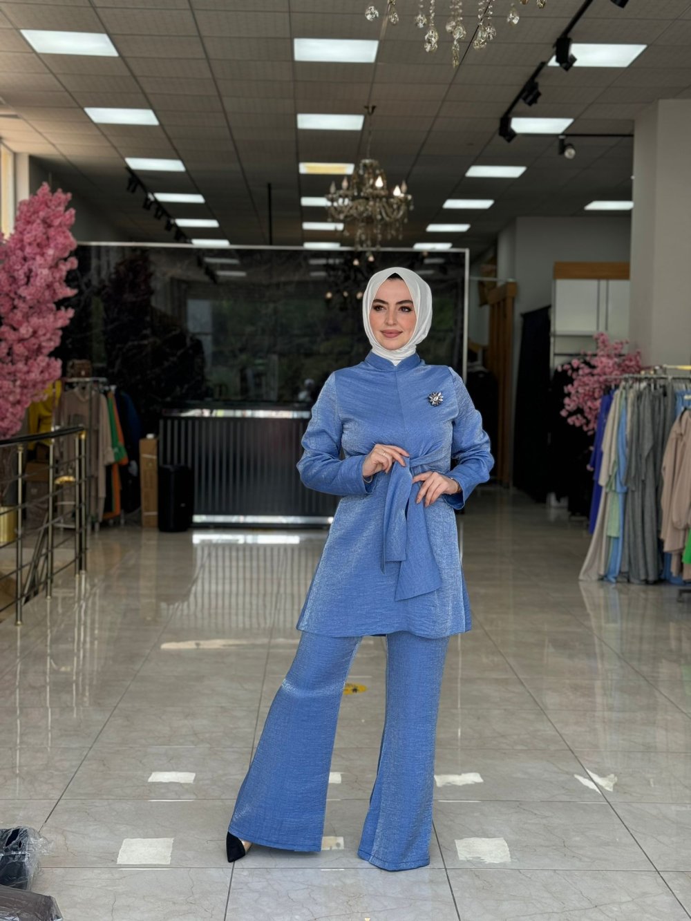 Kumaşı ithal jakardır. Arkası yarım fermuarlıdır. Pantolon beli lastiklidir.