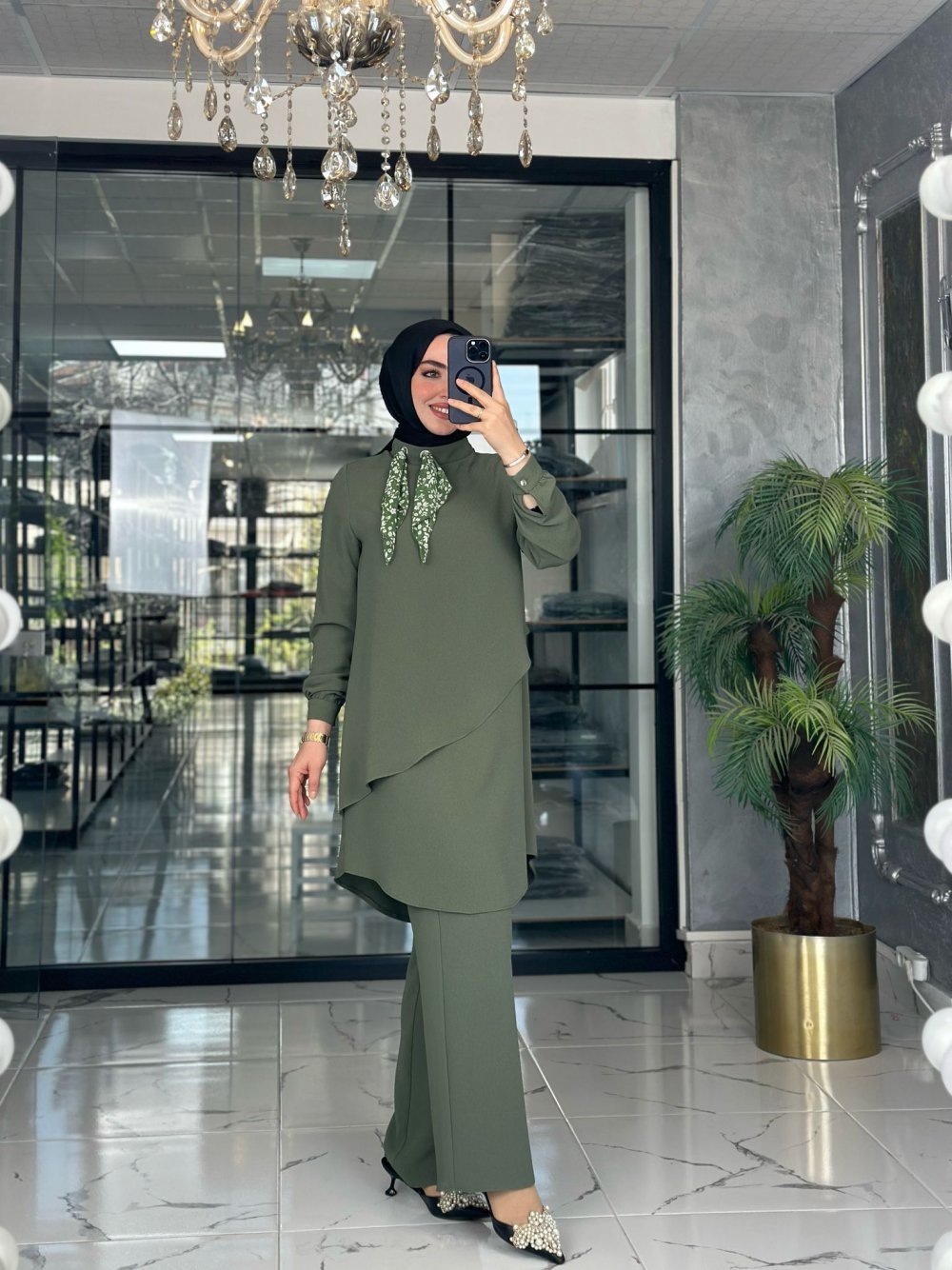Kumaşı ayrobin kreptir. Pantolon beli lastiklidir. Ön Detay Hareketli, Yaka Kuş Gözü Fular Aksesuarlıdır.