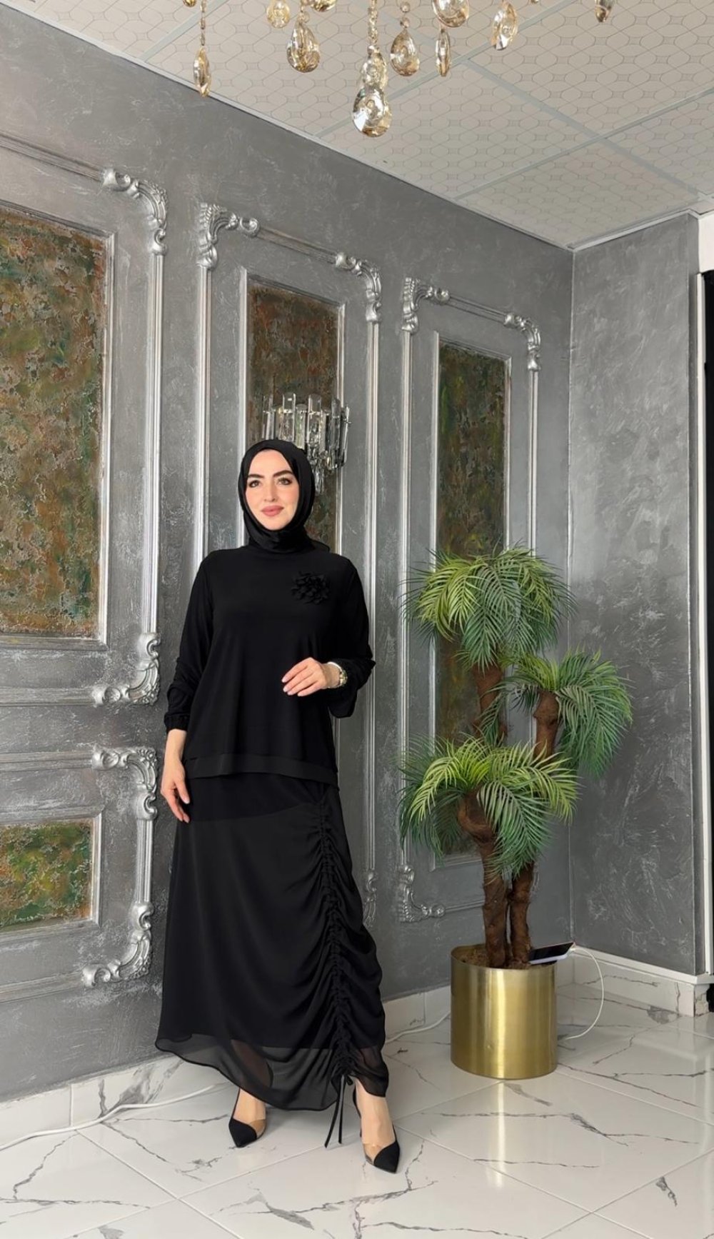 Sandy, Şifon Kumaş, Etek Büzgülü İpli, Yaka Gül Aksesuarlı, Kol Ağızı Lastikli, Etek Beli lastiklidir.