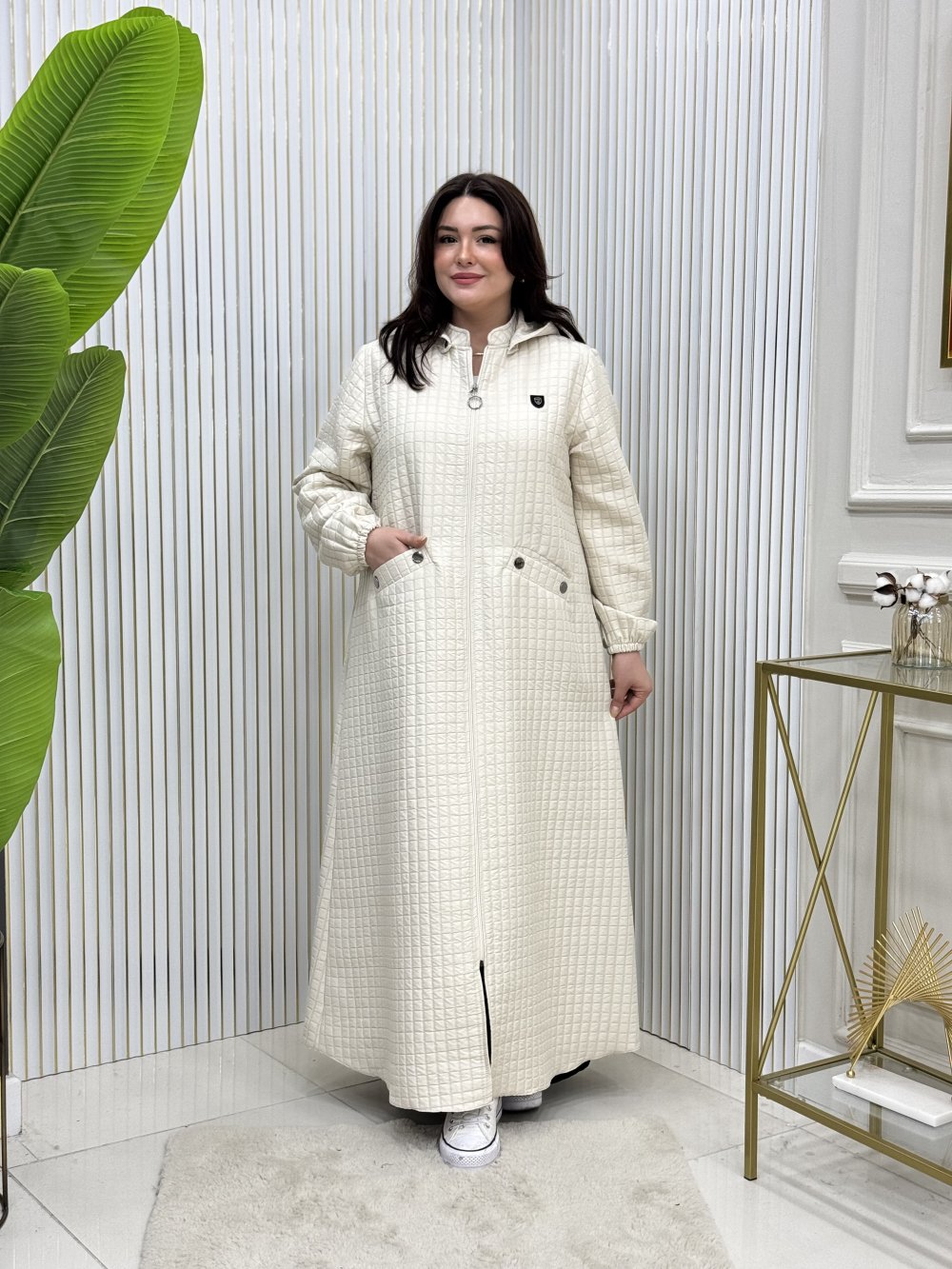 İki yandan cepli, kapüşonlu.