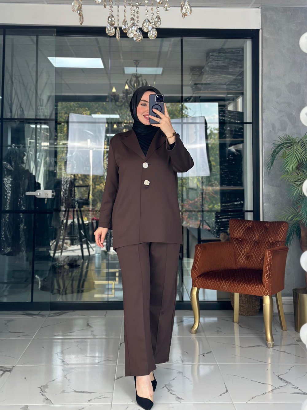 Kumaşı scuba kreptir. Önü düğmelidir. Pantolon beli lastiklidir. Rahat kalıptır.