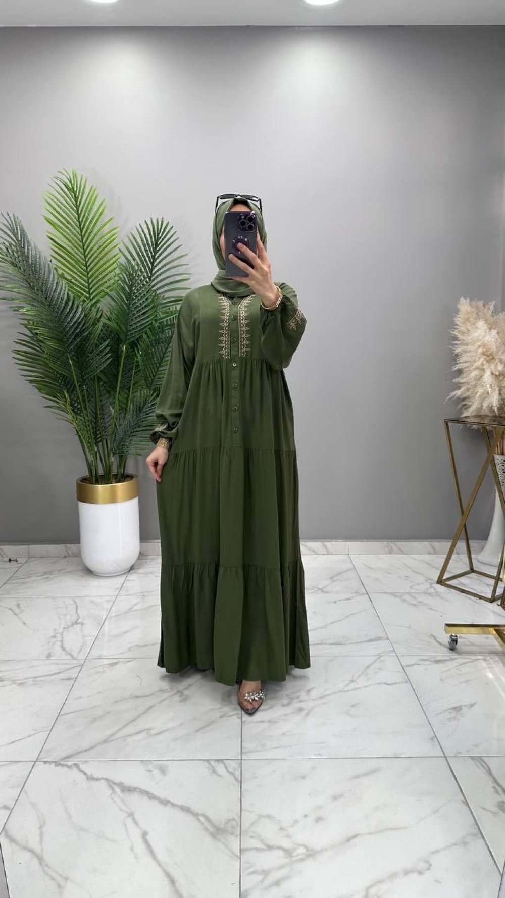 Nakışlı Medine Elbise Haki