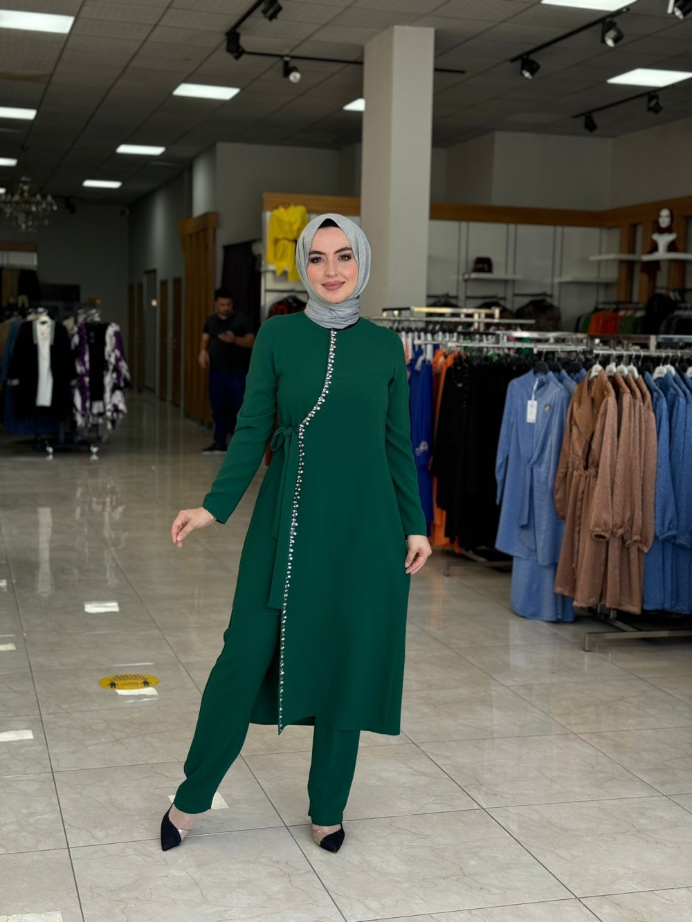 Kumaşı petek kreptir. Taşları yapıştırmadır. Kuşak detayı vardır.