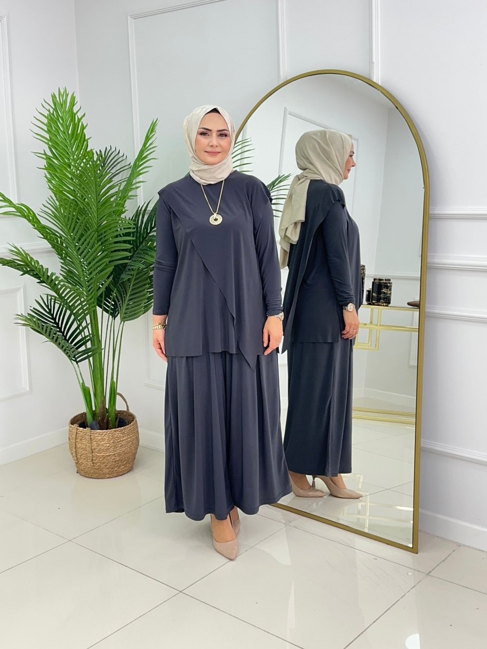?Tunik yuvarlak yakalı, ön kısmı asimetrik kesimli kapak detayı mevcuttur.