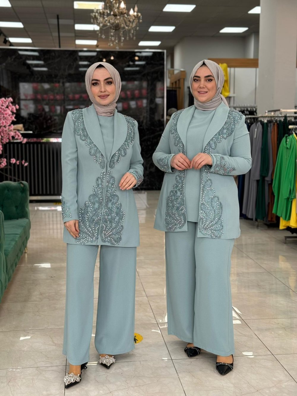 Kumaşı krep kumaştır. İçlik sıfır koldur. Pantolon beli lastiklidir.