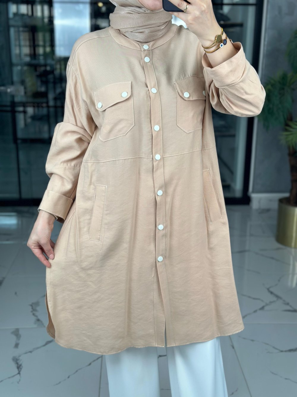Tencel Yıkama Kumaştır. Çıtçıtlı, Ceplidir.