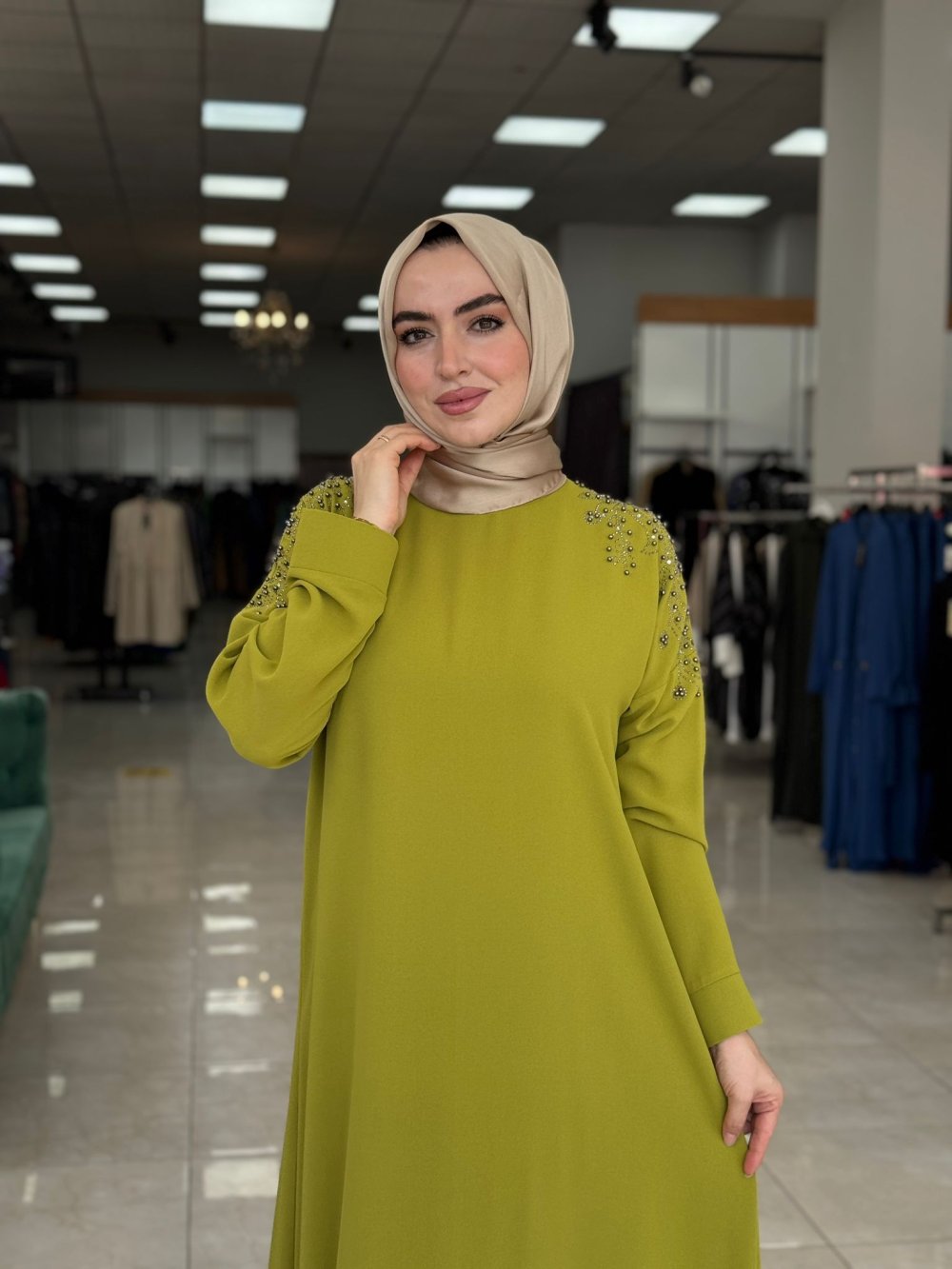 Krep Kumaştır. Omuzlar taş işlemedir.