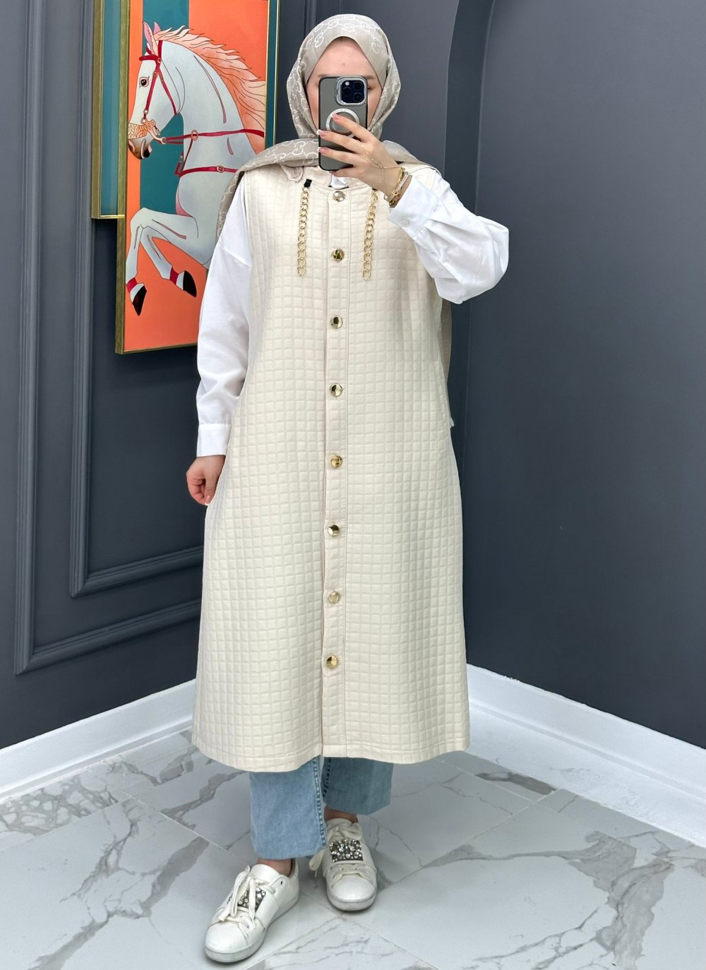 Premium Uzun Yelek - Bej