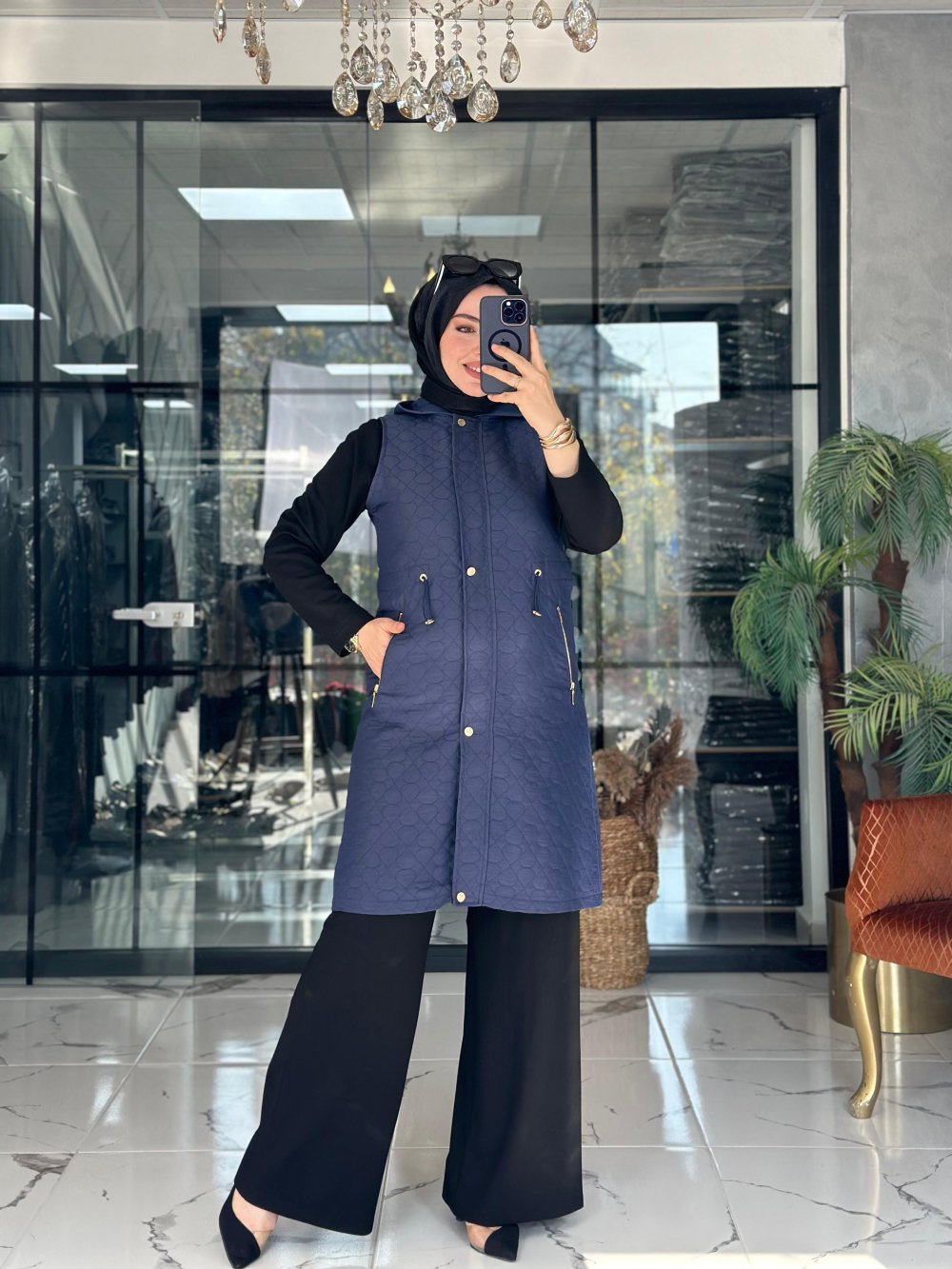 Kumaşı kapitonedir. Önü gizli fermuarlıdır. Kapak çıtçıtlıdır. Cepleri mevcuttur.