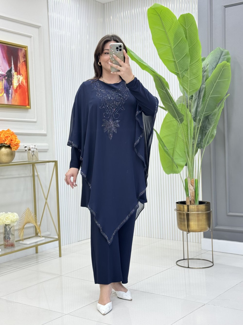 Şifon kısımlarında yırtmaç ve taş detayları vardır.