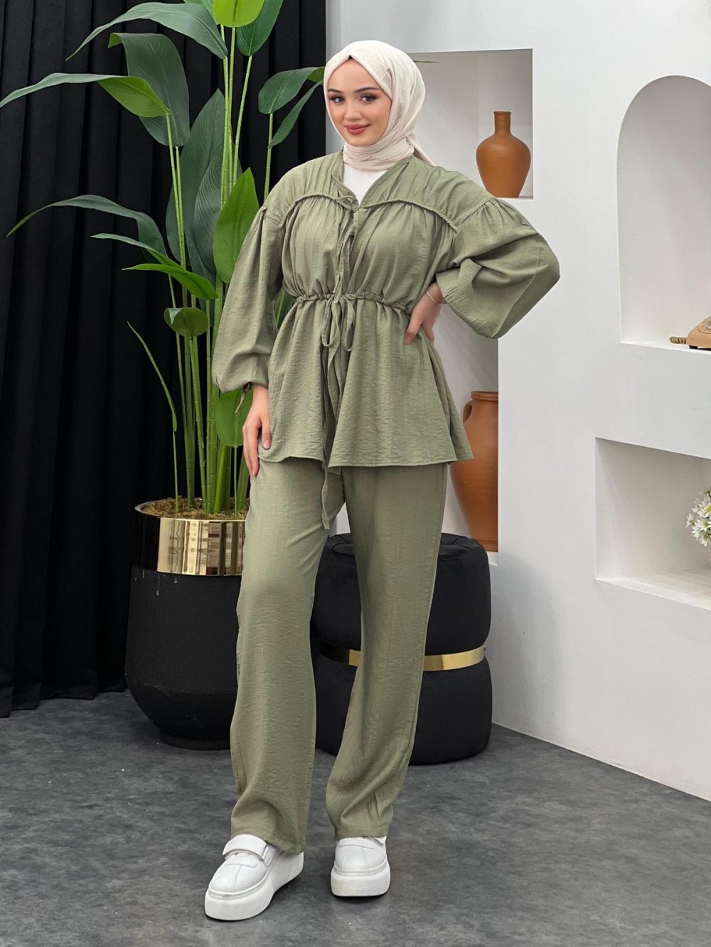 Üst beden bel kısmı ip aracılığı ile büzülüp bele göre ayarlanmaktadır.