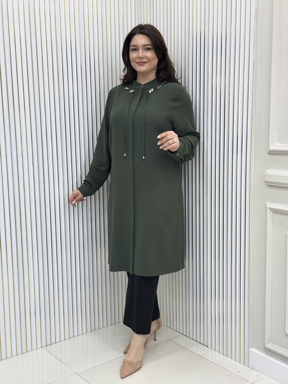 Boydan düğmeli, yaka kısmında taş detaylıdır.