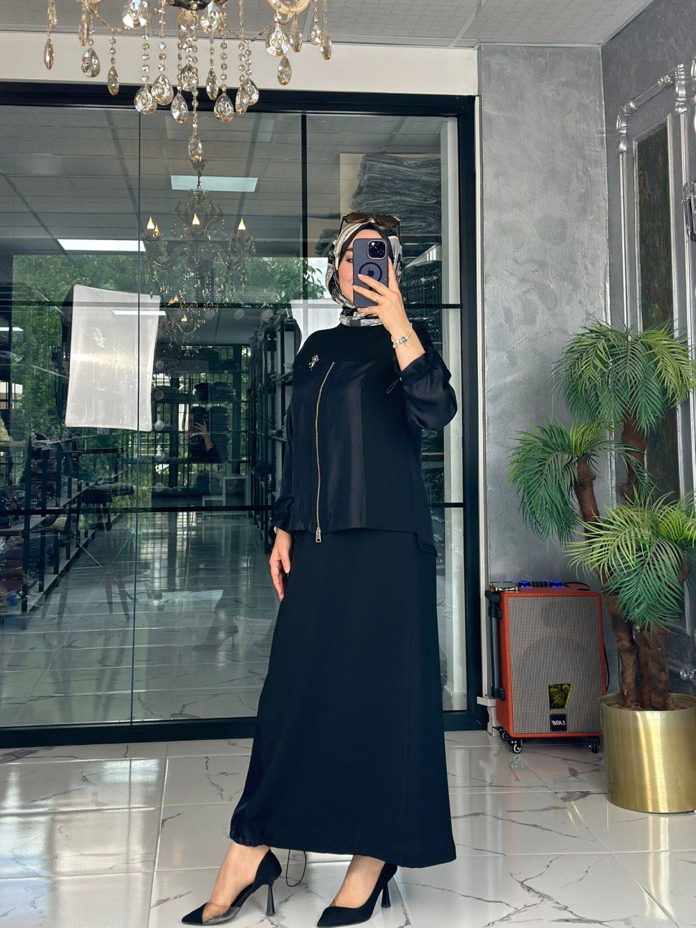 Dokuma Krep ve Parlak Modal Kumaştır.Yarım Fermuar Detaylı,Kol Ağızı Lastik Stoperli, 2cm Dik Yaka,Broş Aksesuarlı,Etek Beli Lastikli,Rahat kalıp Etek Yan Detay Lastik Stoperlidir.