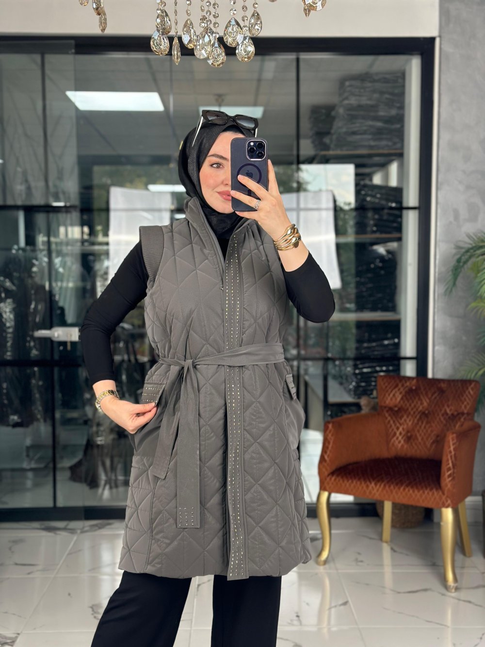 Kumaşı desenli kapitone kumaştır. Önü gizli fermuarlıdır. Seyyar kemeri