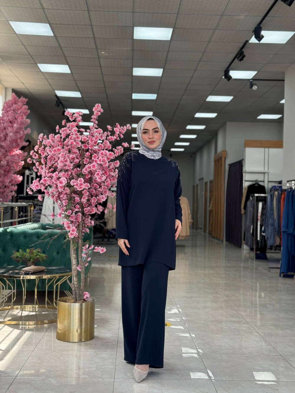 Krep Kumaştır,  Omuz Taş Aksesuarlı, Pantolon Beli Lastikli, Cepsizdir.