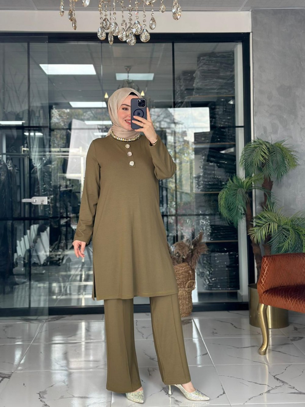 Kumaşı likralı örme kumaştır. Tunik önündeki düğmeler süstür.