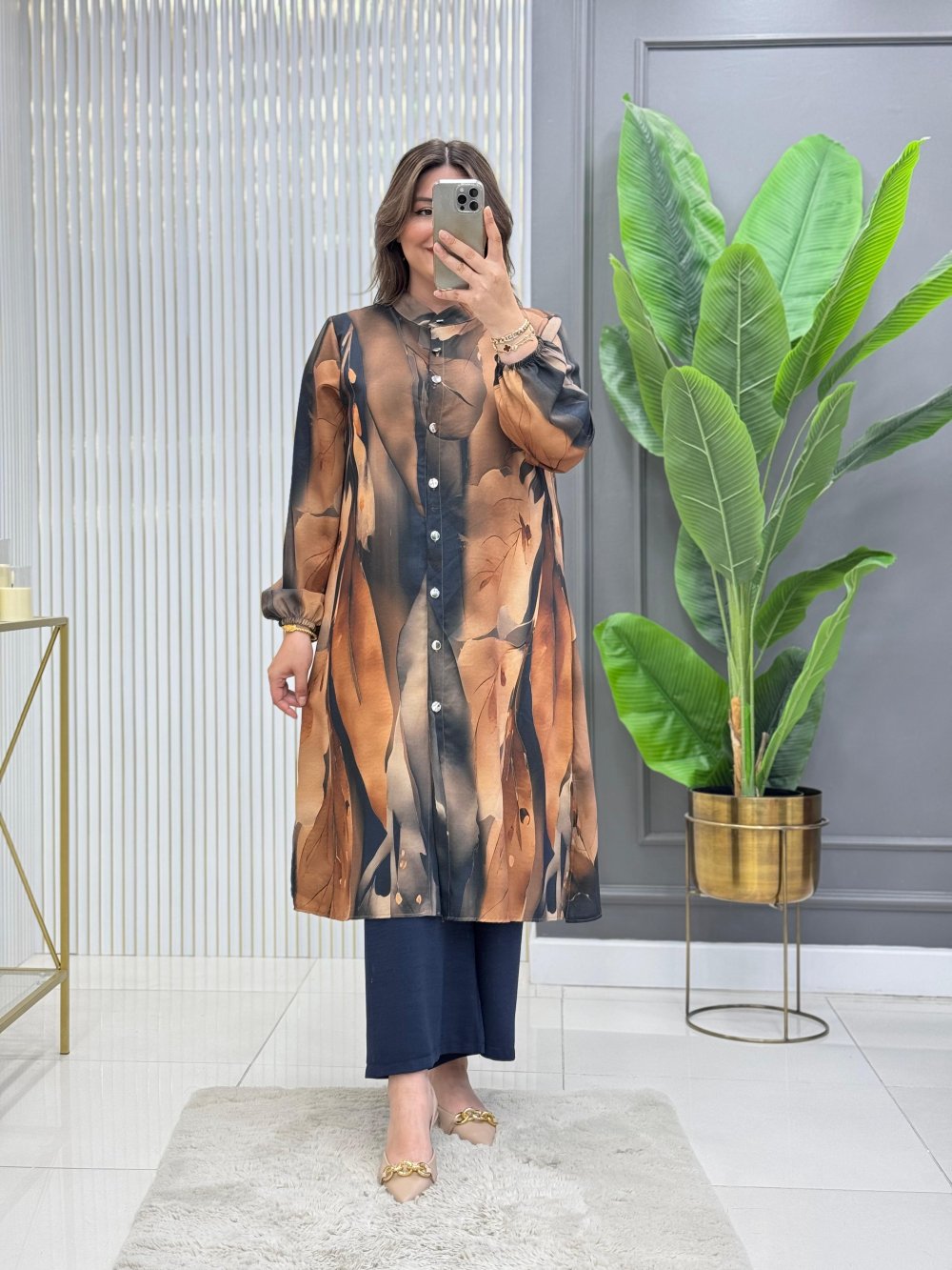 Tunik boydan düğmelidir, kolları lastiklidir.