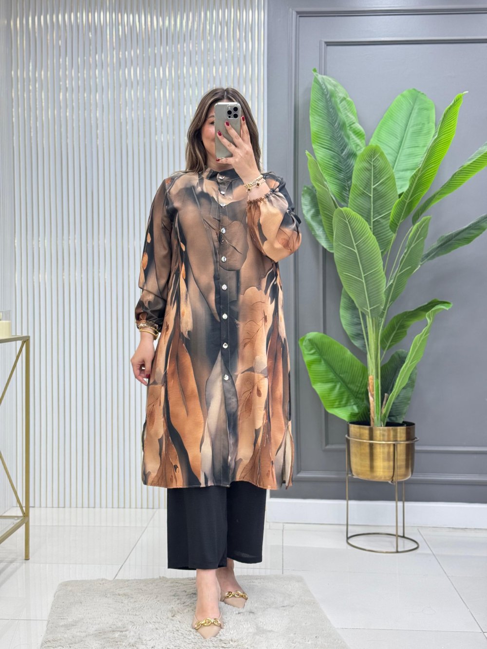 Tunik boydan düğmelidir, kolları lastiklidir.